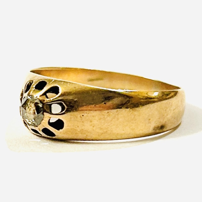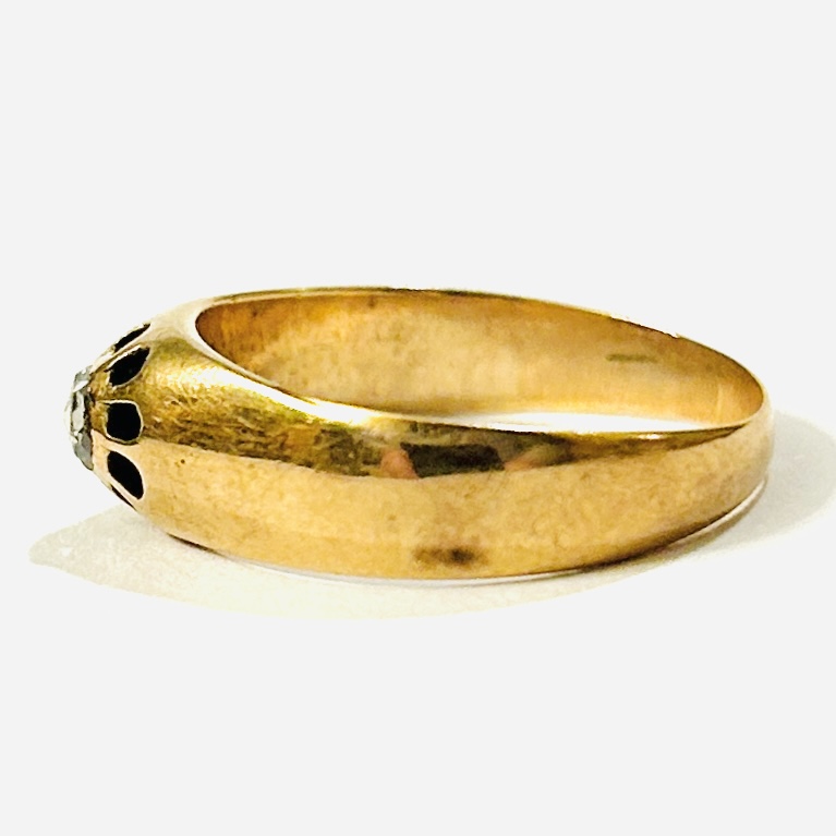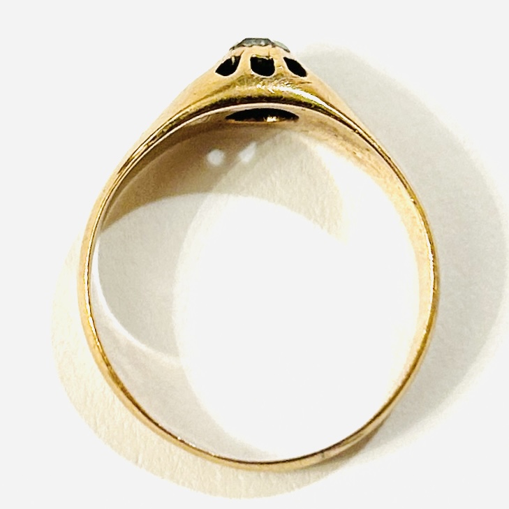 Elegantní prsten typu \“vídeňák\“, který je osazen v mnohokrapnové koruně přírodním diamantem routového brusu o hmotnosti cca 0,15 ct, šína ponechána hladká. Solidní vídeňská zlatnická práce z konce 19. století.