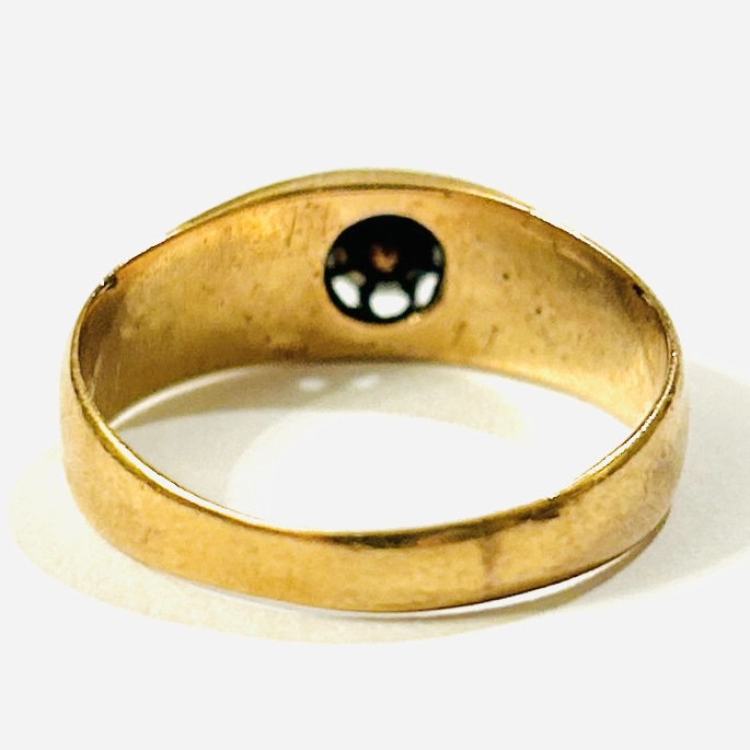 Zhotoveno z narůžovělého 14 karátového zlata, tj. o ryzosti 580/1000; rakousko-uherský punc Z-27 (liška 4) s písmenem \“A\“ (značící vídeňský puncovní úřad) a mistrovská značka \“JG\“ zevnitř šíny. Hmotnost 3,56 g, velikost 57,5, šířka 6,5 mm. Stopy nošení, velikost prstenu v minulosti upravována, jinak v dobrém stavu.