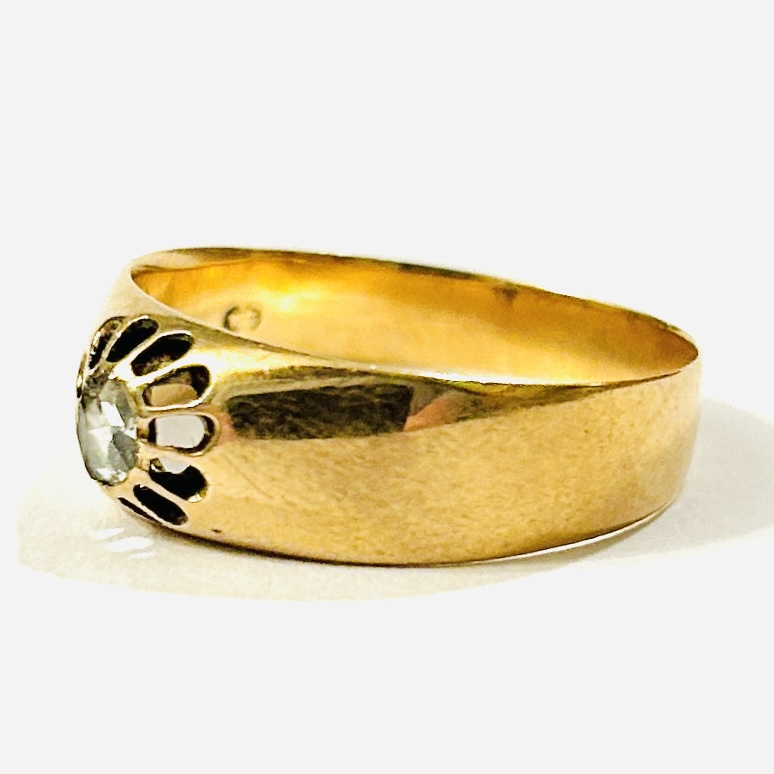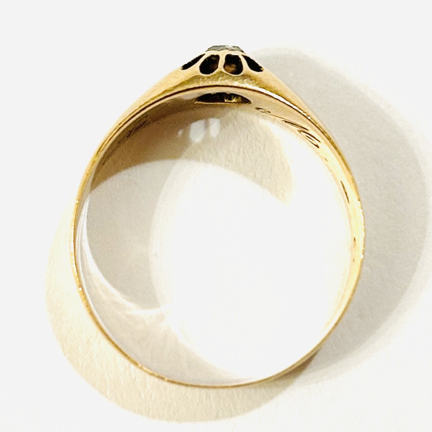 Elegantní prsten typu \“vídeňák\“, který je osazen v mnohokrapnové koruně přírodním diamantem routového brusu o hmotnosti cca 0,15 ct, šína ponechána hladká. Solidní práce pražského klenotníka Wolfganga Gulha z počátku 20 století.