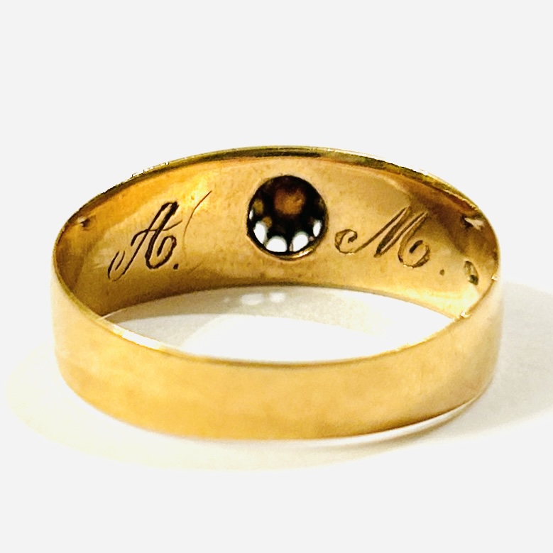 Zhotoveno z narůžovělého 14 karátového zlata, tj. o ryzosti 580/1000; rakousko-uherský punc Z-27 (liška 4) s písmenem \“C\“ (značící pražský puncovní úřad), mistrovská značka \“WG\“ a monogram v psacím písmu \“A\“ a \“M\“ zevnitř šíny. Hmotnost 3,52 g, velikost 61,5, šířka 7 mm. Lehké stopy nošení, jinak v zachovalém stavu.
