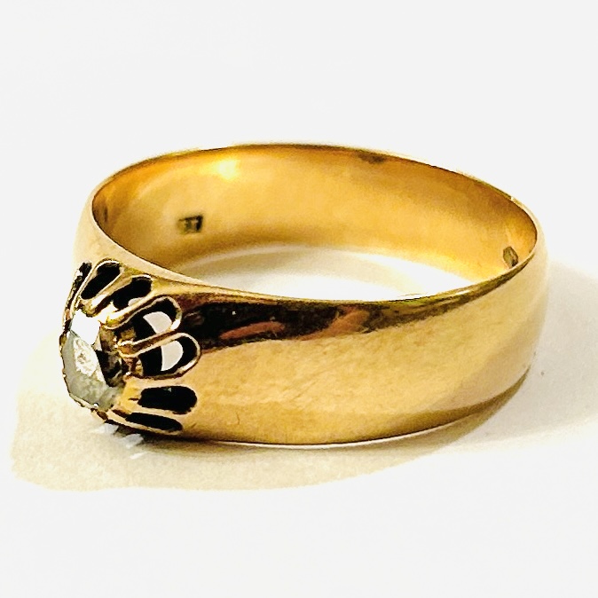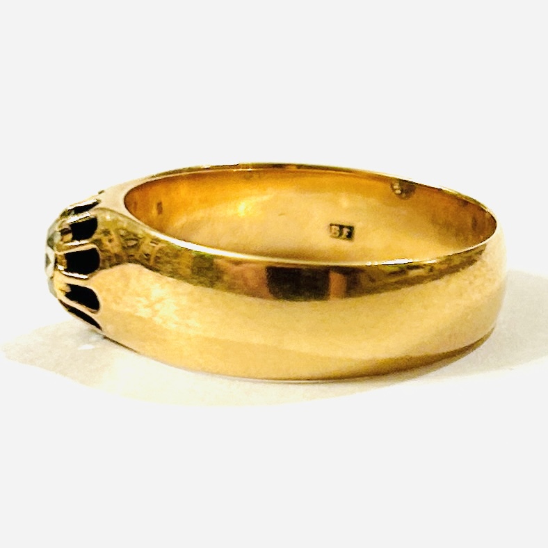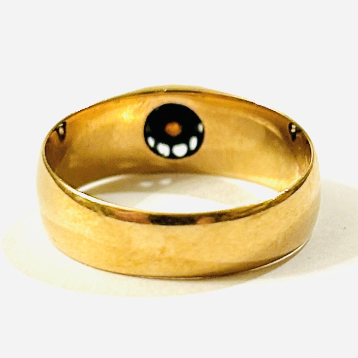 Zhotoveno z narůžovělého 14 karátového zlata, tj. o ryzosti 580/1000; rakousko-uherský punc Z-27 (liška 4) s písmenem \“C\“ (značící pražský puncovní úřad) a mistrovská značka \“BE\“ zevnitř šíny. Hmotnost 4,00 g, velikost 58,5, šířka 7 mm. V zachovalém stavu, odborně vyčištěno.