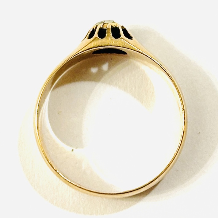 Elegantní prsten typu \“vídeňák\“, který je osazen v mnohokrapnové koruně přírodním diamantem routového brusu o hmotnosti cca 0,20 ct, šína ponechána hladká. Solidní práce patrně z pražské klenotnické dílny bratří Faukenau z konce 10. let 20. století.