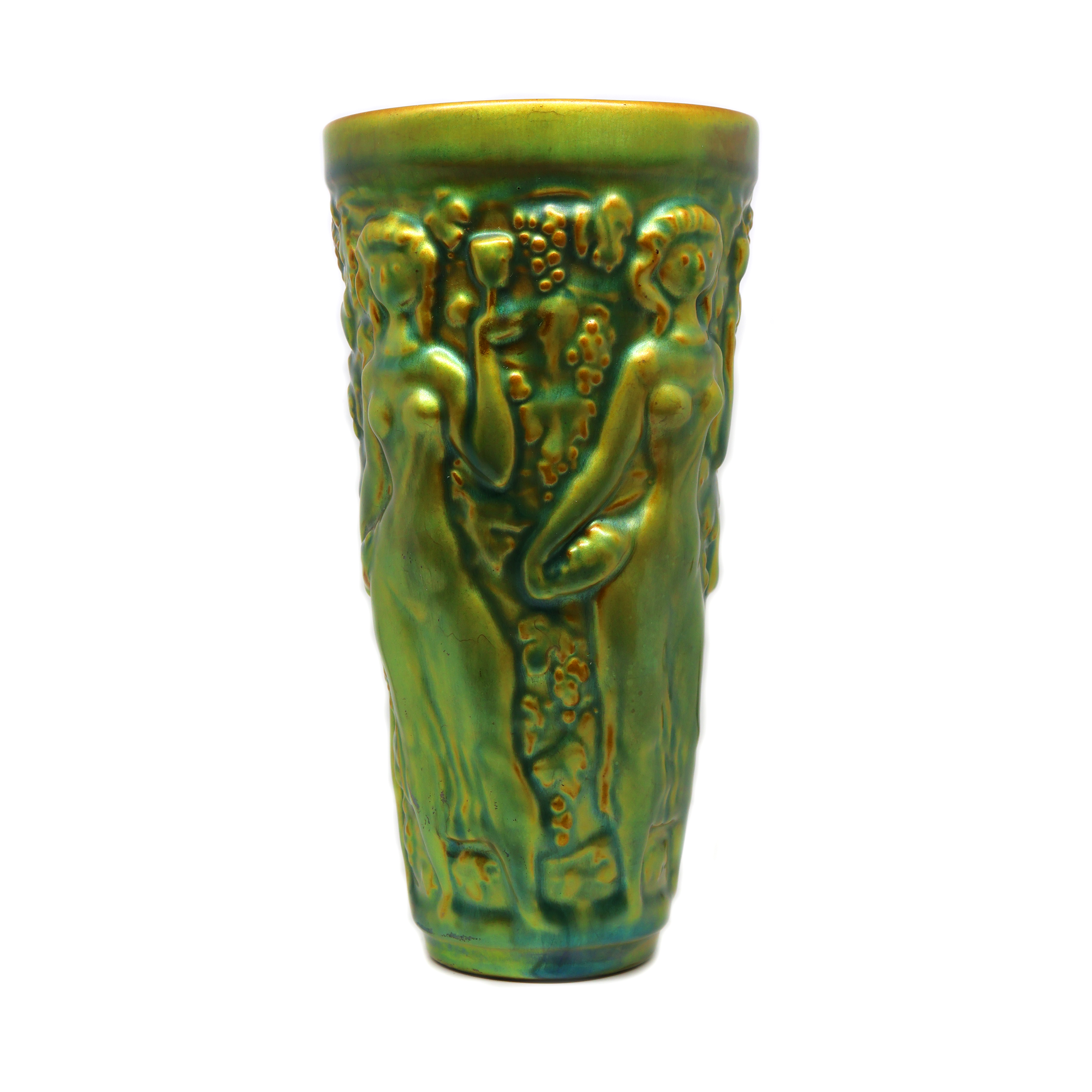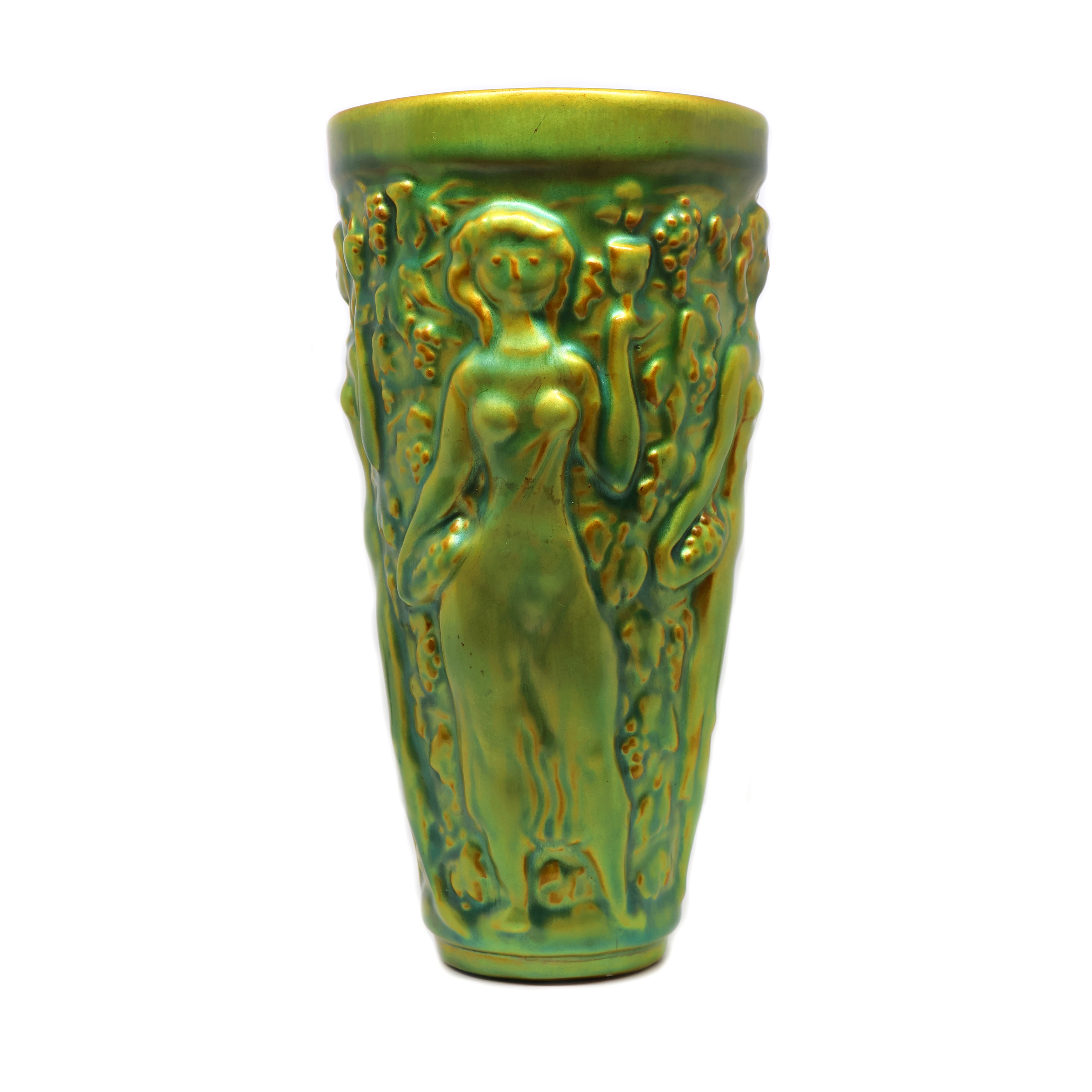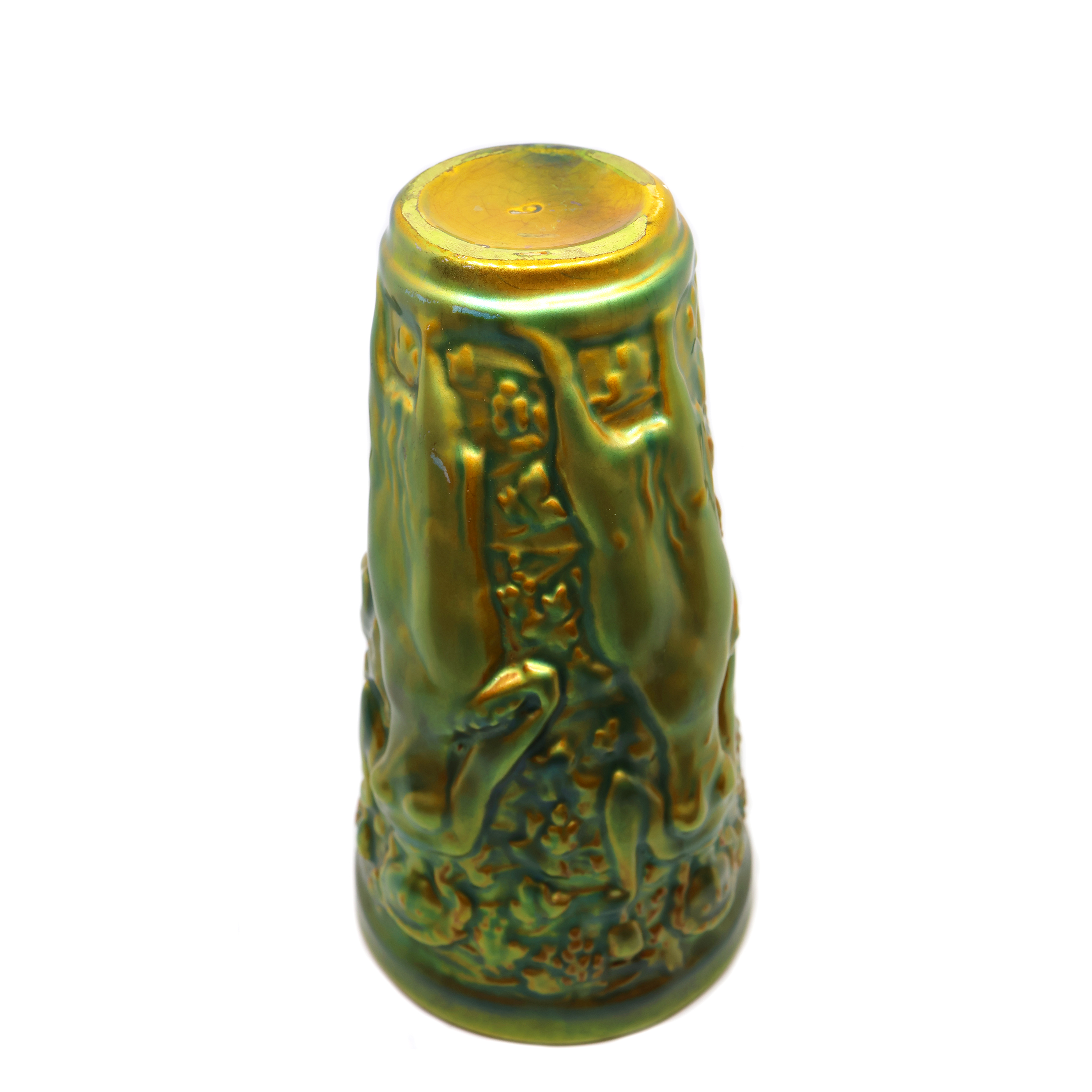 Sochařská duhová keramická plastika (Eosine) Autor: Vilmos ZSOLNAY ( 1828- † 1900) Váza zdobená ,,oslavou sklizně hroznů,, Signováno zespodu Výška 16,5cm Výborný stav viz foto