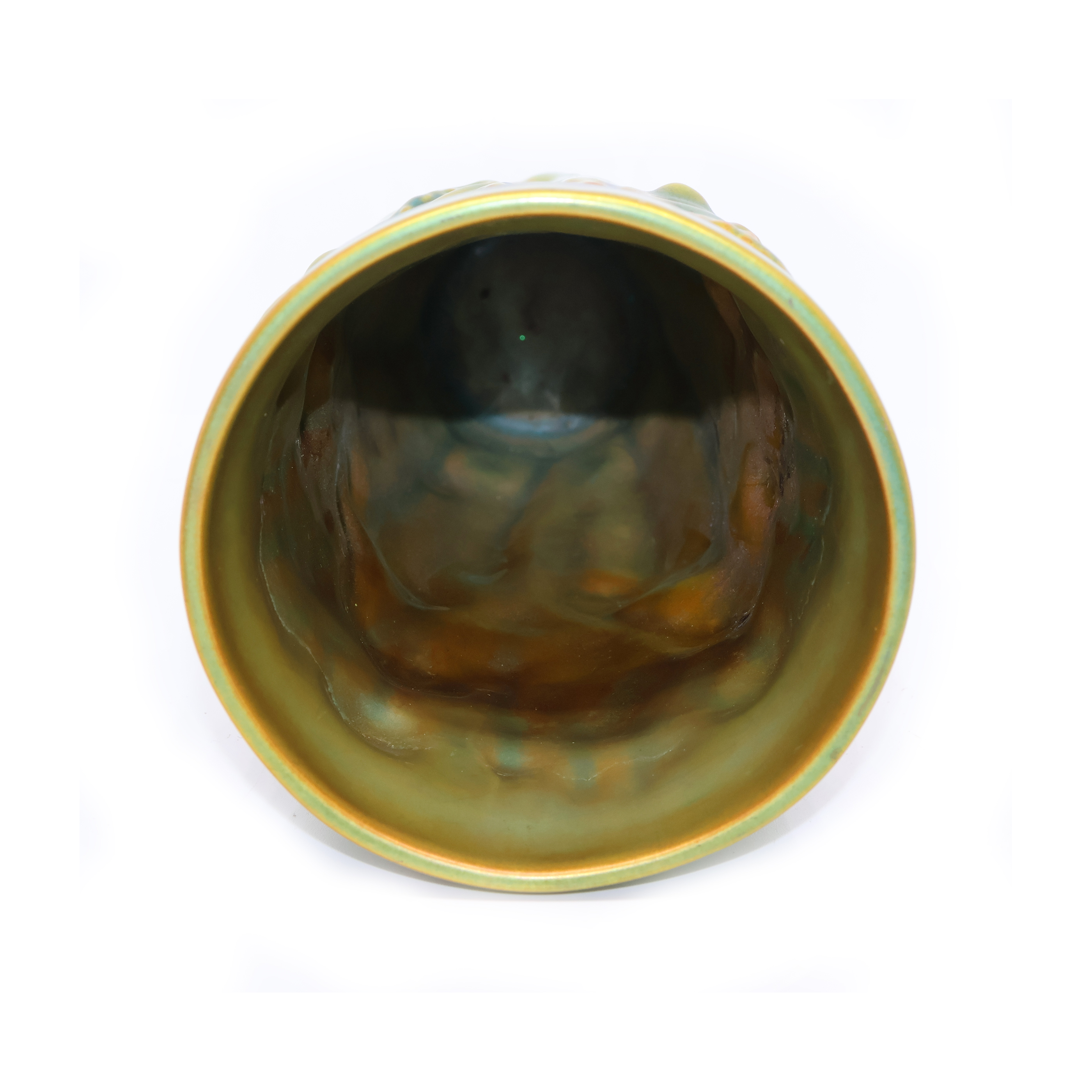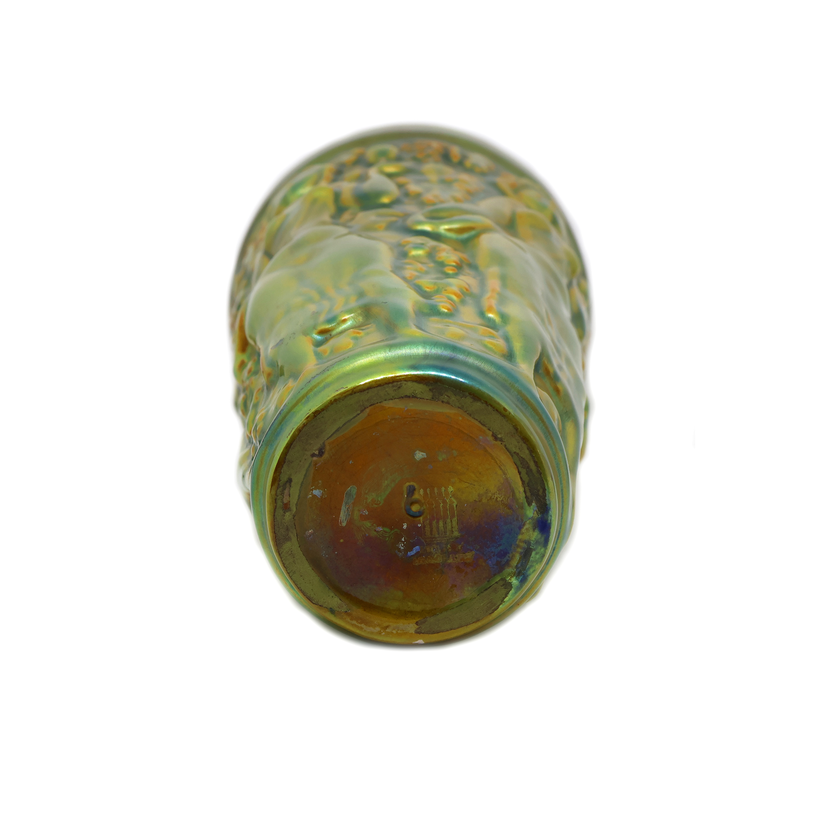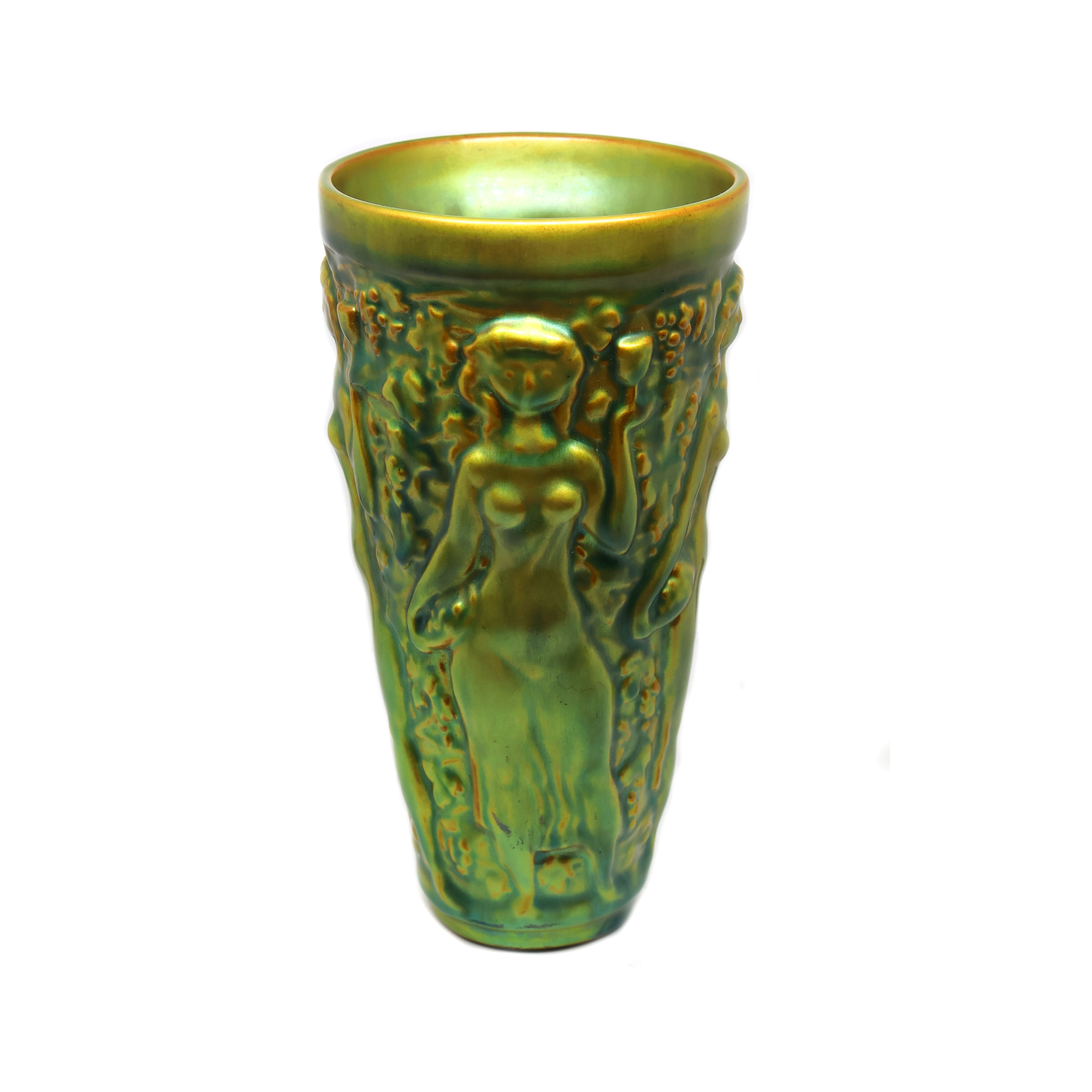 Sochařská duhová keramická plastika (Eosine) Autor: Vilmos ZSOLNAY ( 1828- † 1900) Váza zdobená ,,oslavou sklizně hroznů,, Signováno zespodu Výška 16,5cm Výborný stav viz foto